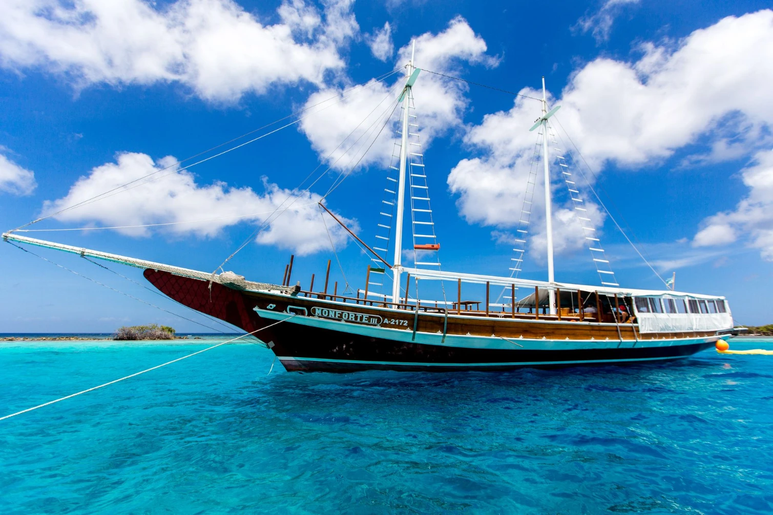 Her story began along the Atlantic shores of Brazil, where she sailed for many years before making her way to Aruba. Today, she rests in the calm waters of the Palm Beach, offering a more intimate and elegant way to experience the island.
